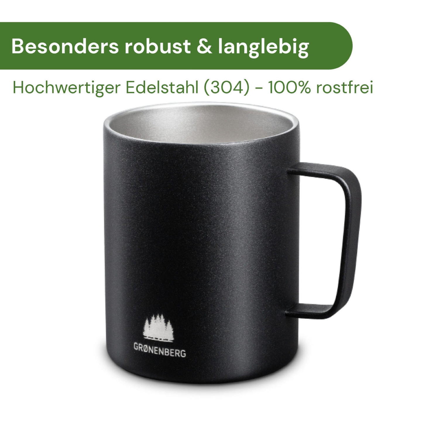 Da schmeckt der Kaffee oder Tee noch länger noch besser! Schöne robuste, doppelwandige Edelstahltasse für den aus extra hochwertigem 304er Edelstahl, der sie vor Rost schützt, besonders lebensmittelfreundlich und unzerbrechlich macht.