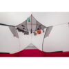 Innenbereich: Die rechteckige Grundfläche (ohne wie sonst übliche konische Seiten) ist ausreichend groß für Bewohner samt Ausrüstung und hat eine großzügige Giebelhöhe von 107 cm. Die Zeltplane ist eine Mischung aus Netz- und Feststoff für Lüftung, Privatsphäre und Schutz vor Wasser. Die kurvenfreien Zelteingänge haben Reißverschlüsse, die sich mit einer Hand bedienen lassen. Zudem enden die Reißverschlüsse nach dem Zuziehen immer an derselben Stelle, damit der Schieber auch im Dunkeln gefunden werden kann. Staufächer für Geräte aller Art haben Kabelführungen an den Ecken für Ladekabel. Große Ablagen über Kopfhöhe sind ideal für Handschuhe, Sonnenbrillen und mehr. Wäscheleine innen und optional auch außen (im Lieferumfang enthalten) bieten viel Platz zum Aufhängen nasser Kleidung.