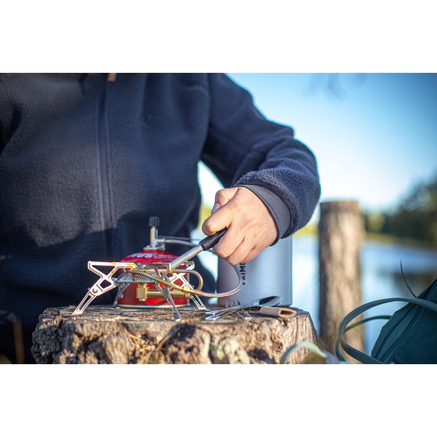 Dank der Vorheizspule kann der Gravity-Kocher auch in der kalten Jahreszeit verwendet werden, hat eine Leistung von 2.700 W und bringt einen Liter Wasser in weniger als vier Minuten zum Kochen. Der unabhängige, T-förmige Piezo-Zünder funktioniert bei jeglichen Wetterverhältnissen, was ihn zum perfekten Begleiter macht. Die im Zünder eingebaute Sechskantschraube dient zur Bedienung des Kochers.